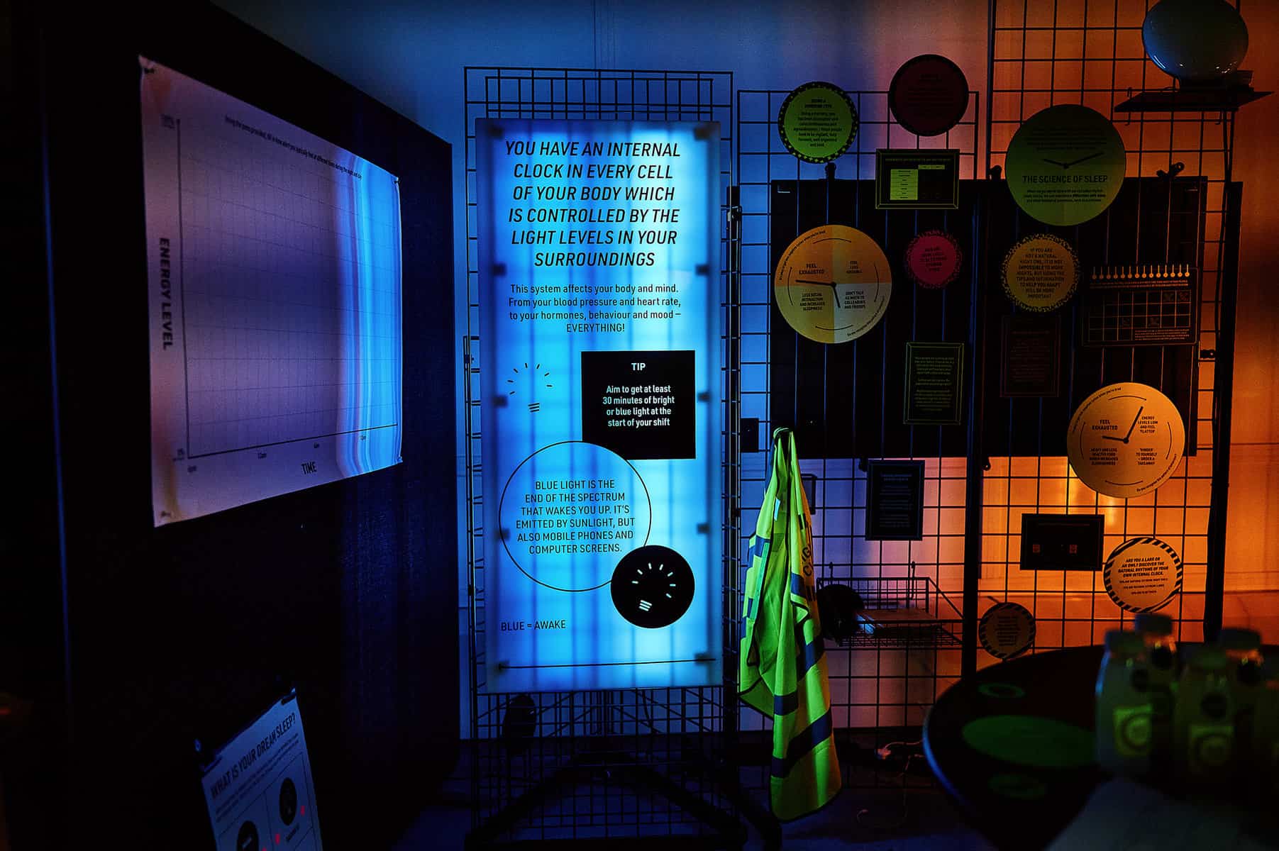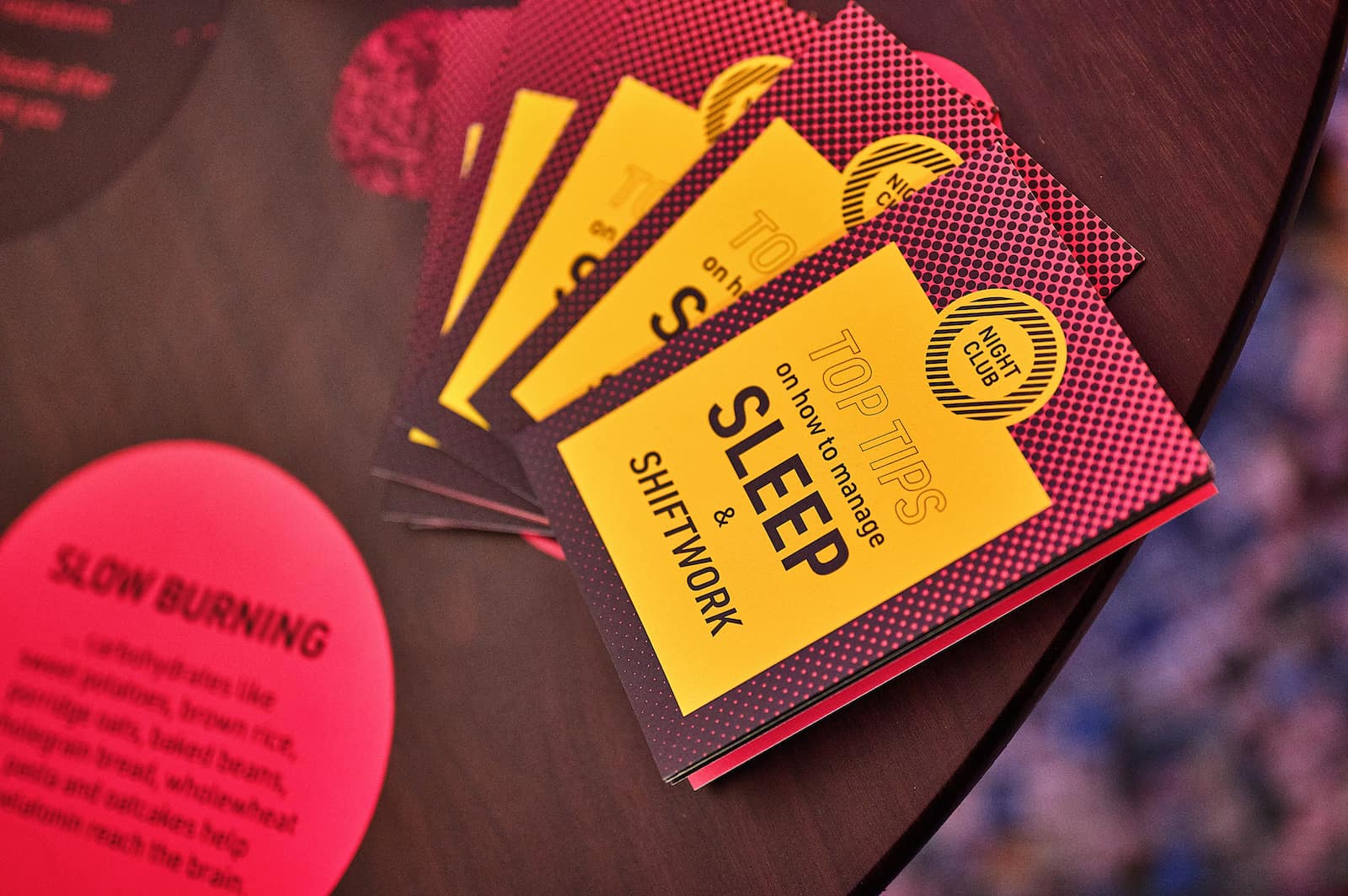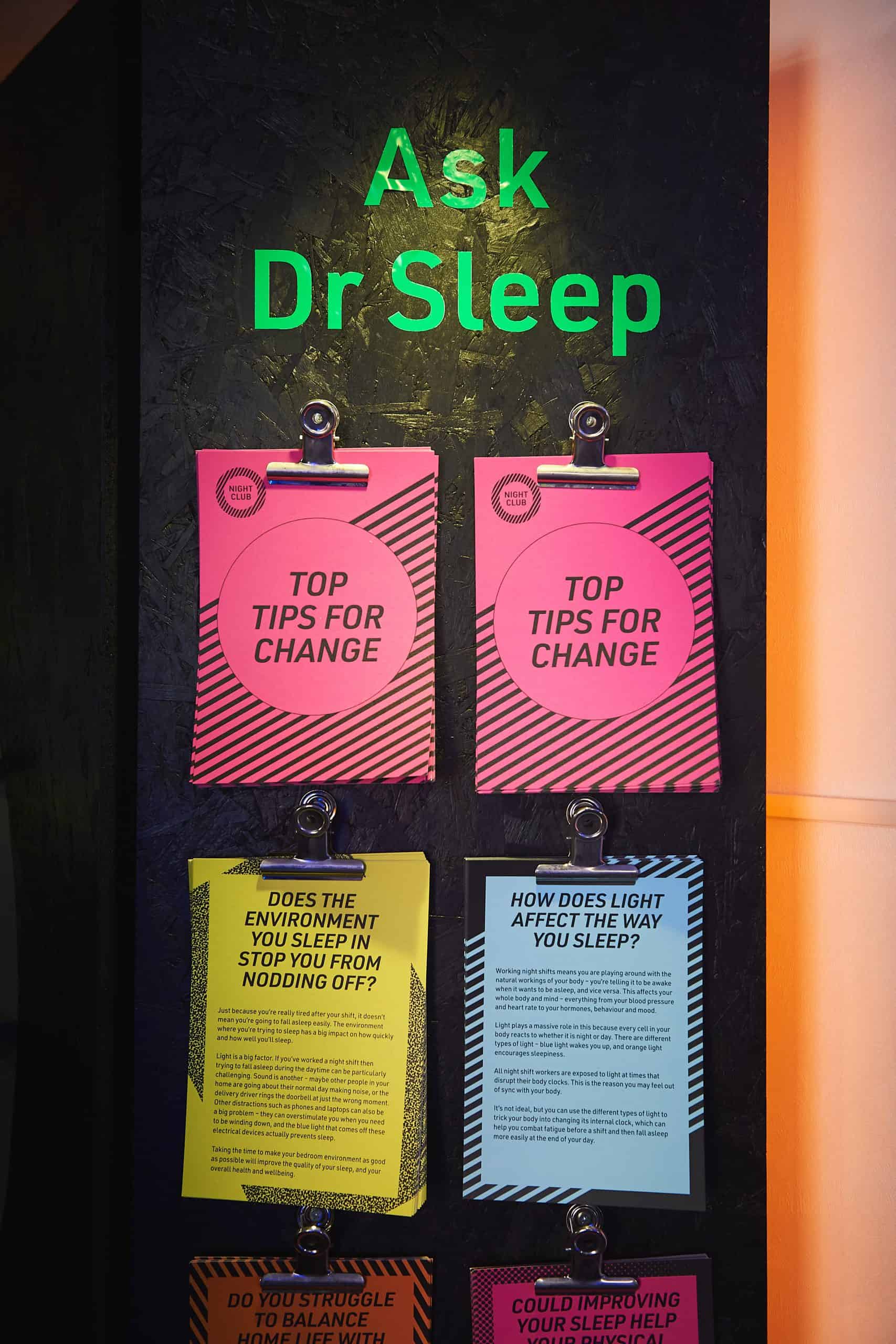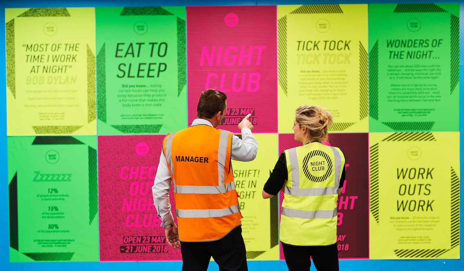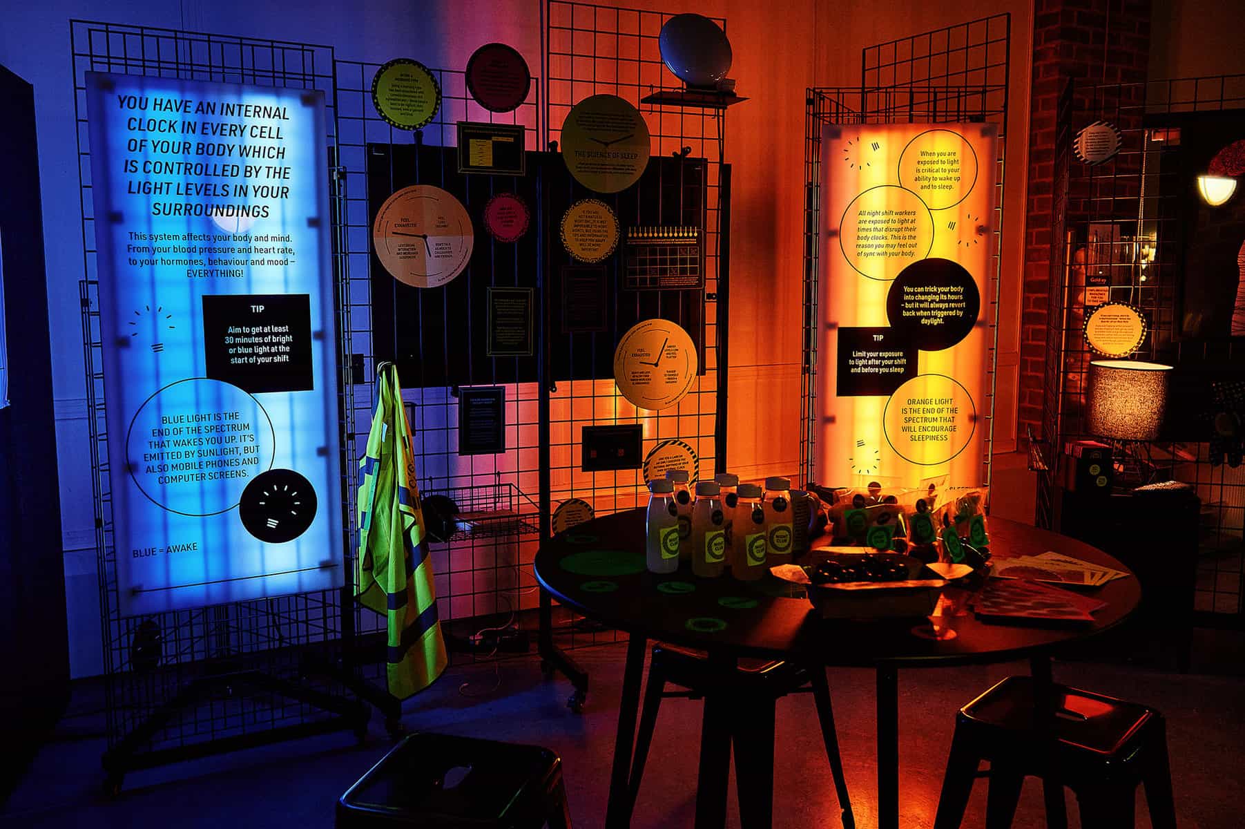 NIGHT CLUB is an award-winning engagement programme that brings workers and employers together with sleep scientists to help mitigate the negative impact of shift work. Co-designed with night shift workers and devised by The Liminal Space, NIGHT CLUB innovates wellbeing training through the lens of art and design. The interactive installation combines evidence-based content with bright lights, neon colours and bold provocations to inspire action and spark imagination. Check out the events programme on night-club.org.